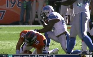 Detroit Lions linebacker Stephen Tulloch strikes a "Tebowing" pose immediately following his sack of the quarterback
